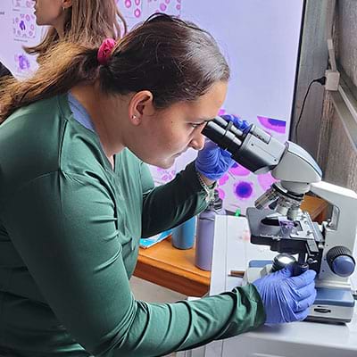 In hands-on clinical lab rotations, you’ll practice essential skills including using a microscope to examine specimens, suturing techniques, necropsy procedures, and conducting physical exams.